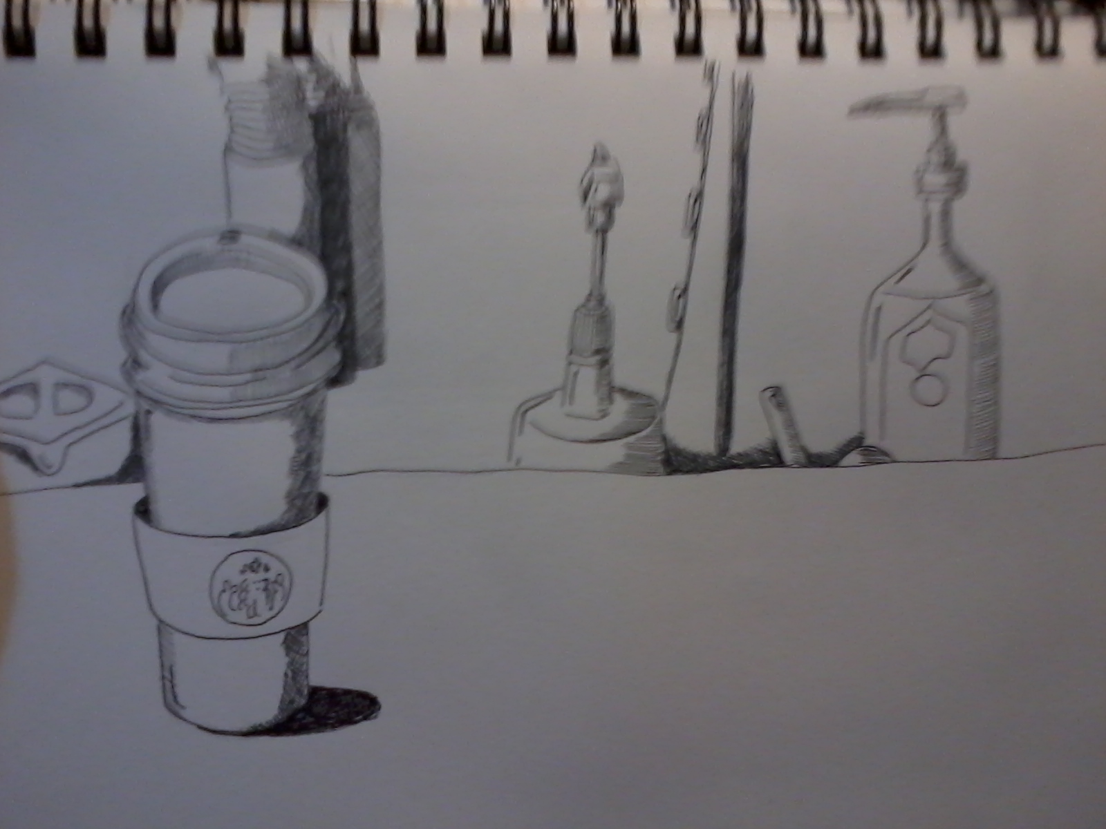 After I got the news, I decided to go to a local Starbucks and just veg for a while, something I rarely get to do anymore. I am glad that I had my Ipod with me, because I just wasn't into the Ho Ho Ho music they had playing today.This Starbucks was particularly packed, but they have a deal going on (until Sunday) where you can purchase a holiday beverage, and get one free of equal or lesser value. Thankfully, I had enough left on my Starbucks card, so I bought one drink for there, and one drink for the road. I also managed a quick sketch while I sat at the counter... I left a lot out, because I simply didn't have the time, but I'll play around with it and see what becomes of it.